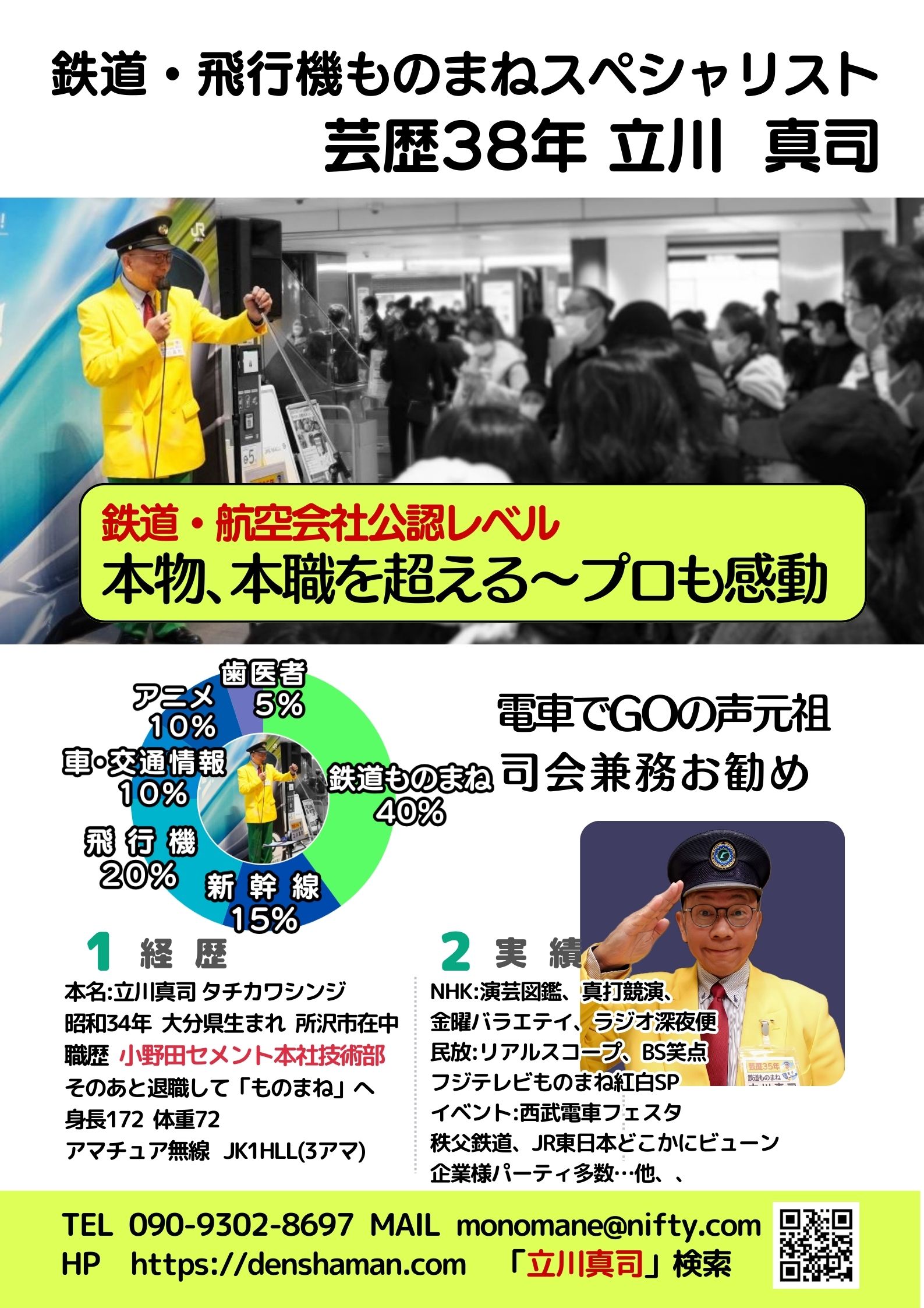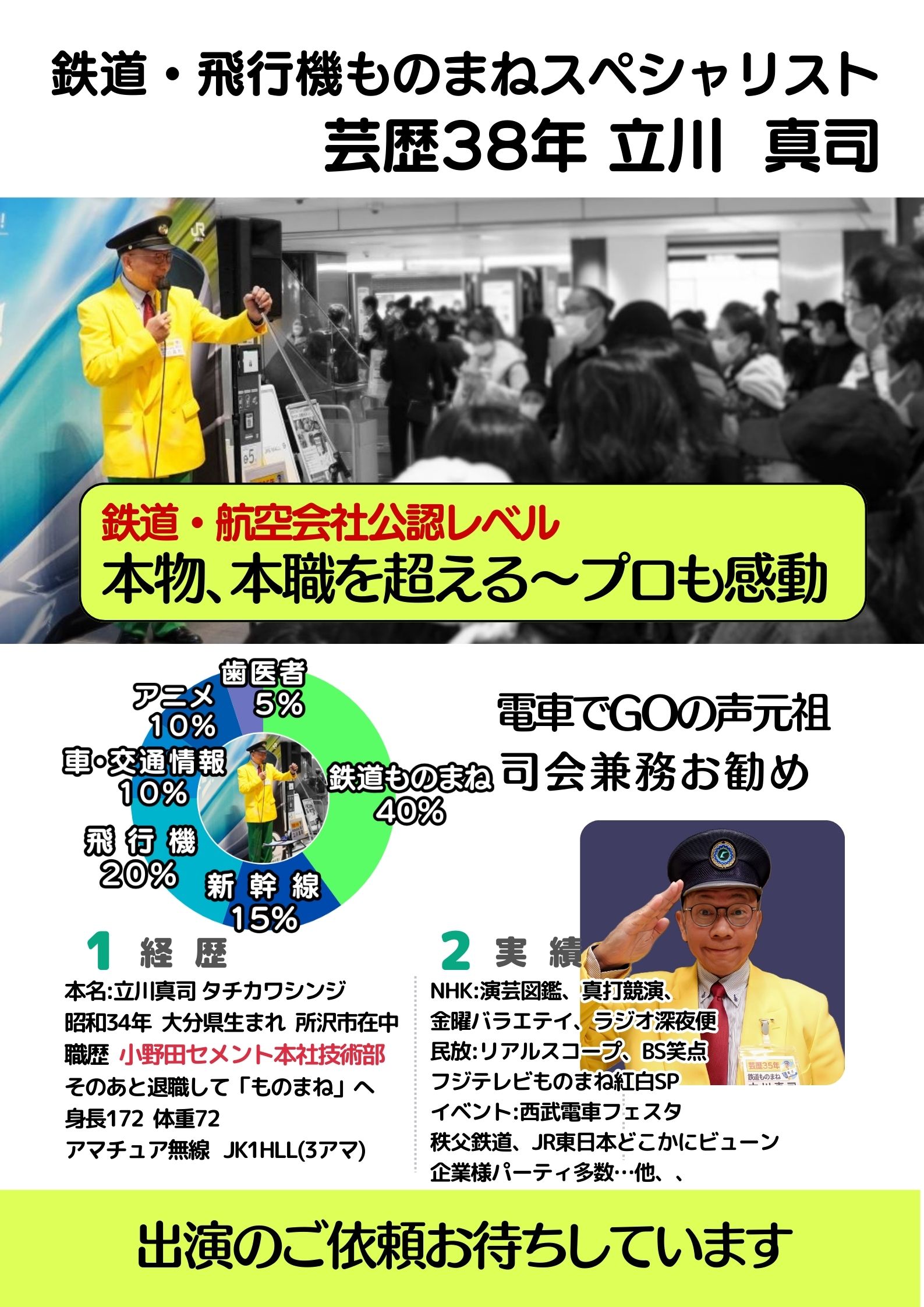 幼い頃から好きだった乗り物。いつの間にか、乗り物を主とする「ものまねタレント」になってしまいました。好きだからこその視点で、鉄道、飛行機、車、等々を始めとする多彩なショーアップを完成しました。